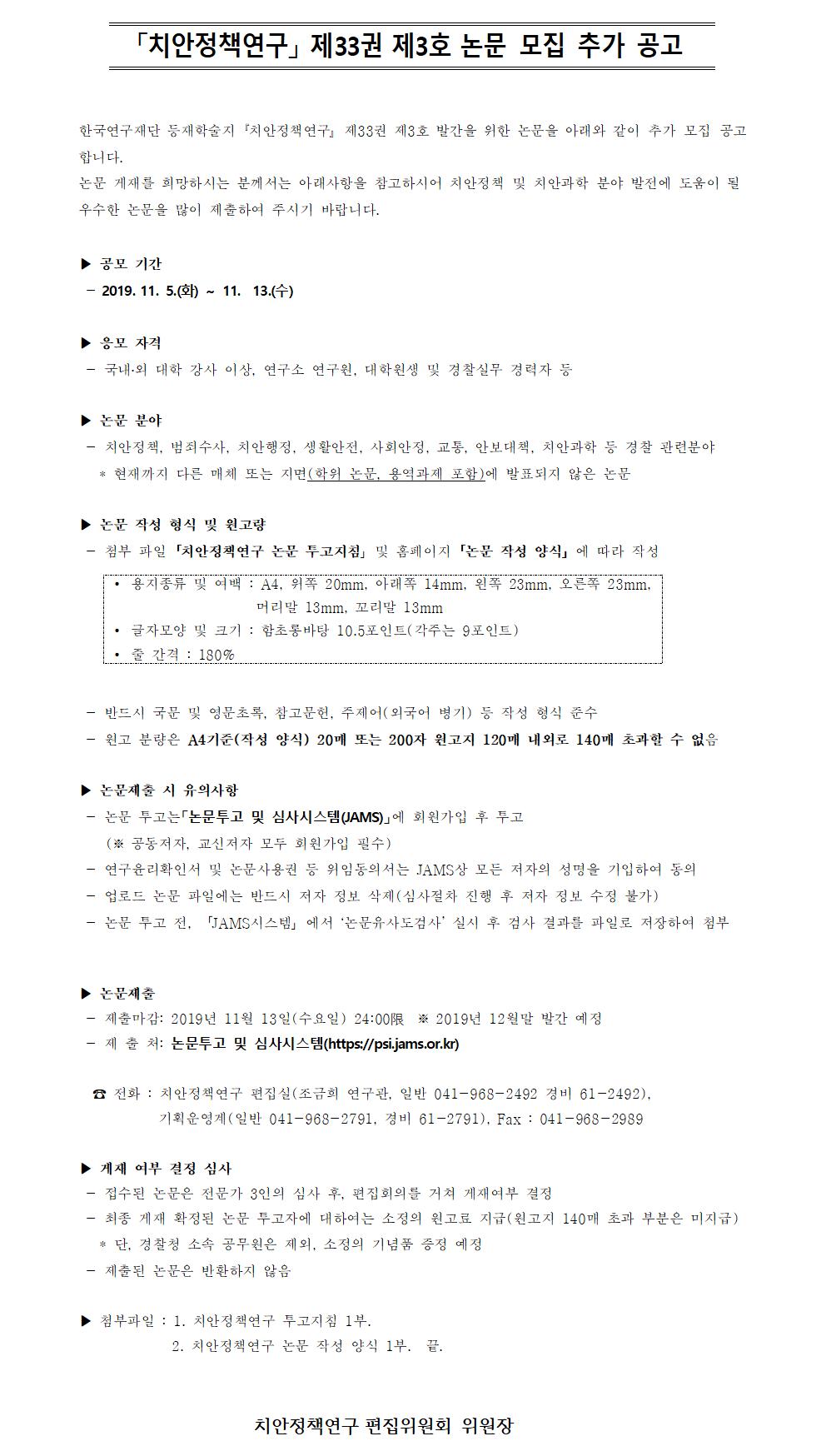 「치안정책연구」 제33권 제3호 논문 모집 추가 공고